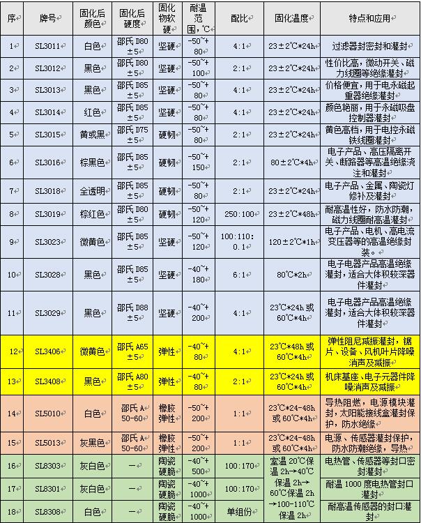 種類繁多的灌封膠又如何選擇呢?作為灌封膠的使用單位需要查看哪些性能數據才能對選擇灌封膠有幫助呢?下表是世林膠業(yè)在灌封膠方面的產品,可供您選擇參考,這里列舉的產品種類很多,功能也各不相同,如果您還有其他的特殊要求也可以和世林的工廠技術人員進行交流,只有清楚知道您的實際用膠需求,我們才能給您提供全套的灌封用膠的解決方案。