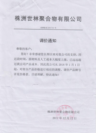 世林膠業(yè)2018年1月調(diào)價通知