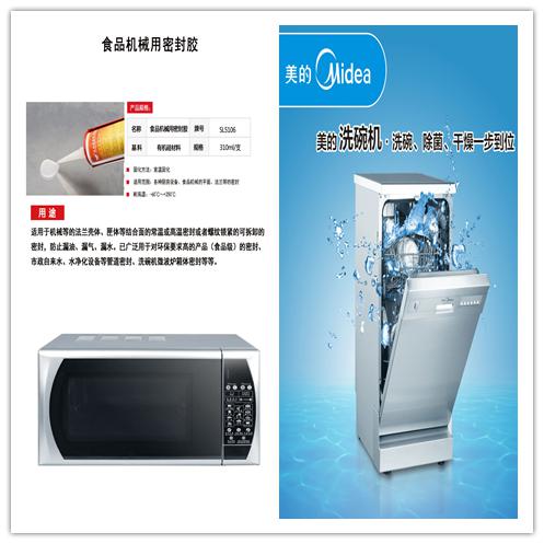 美的生產(chǎn)的洗碗機(jī)上就選用了世林膠業(yè)生產(chǎn)的SL5106食品級耐高溫密封膠,用在產(chǎn)品的間隙處,完全解決了耐高溫,防水,防塵,耐候性強(qiáng),可拆卸等問題。